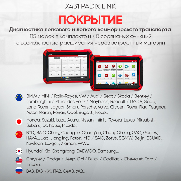 Карта покрытия диагностического сканера Launch X431 PADIX Link