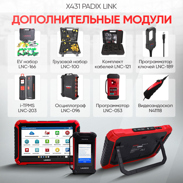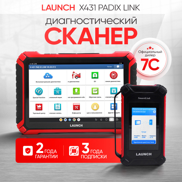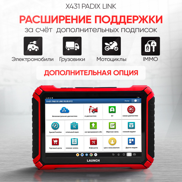 Launch X431 PADIX - новый флагман в линейки диагностических сканеров Launch PAD. Он стал больше, легче и быстрее. Новые характеристики планшета и нового VCI адаптера Smartlink v3.0 позволяют проводить диагностику в несколько раз быстрее. По функциональной части PADIX идентичен предыдущей модели PADVII. В комплект поставки входит 40 спецфункций, 115 марок с возможностью расширения через Молл. 3 года обновлений и 2-летняя гарантия. Опционально вы можете расширить функции сканера за счет следующих пакетов ПО: EV, IMMO и TRUCK.