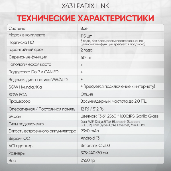 - Поддержка базы данных X431-Fix (Haynes Pro) для быстрого решения проблем (опция)