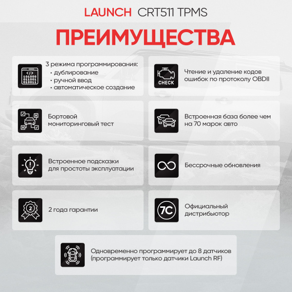 • В режиме активации поддерживается до 98% оригинальных моделей датчиков для различных марок автомобилей