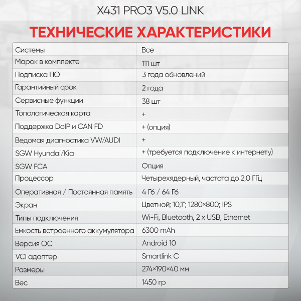 - Поддержка базы данных X431-Fix (Haynes Pro) для быстрого решения проблем (опция)